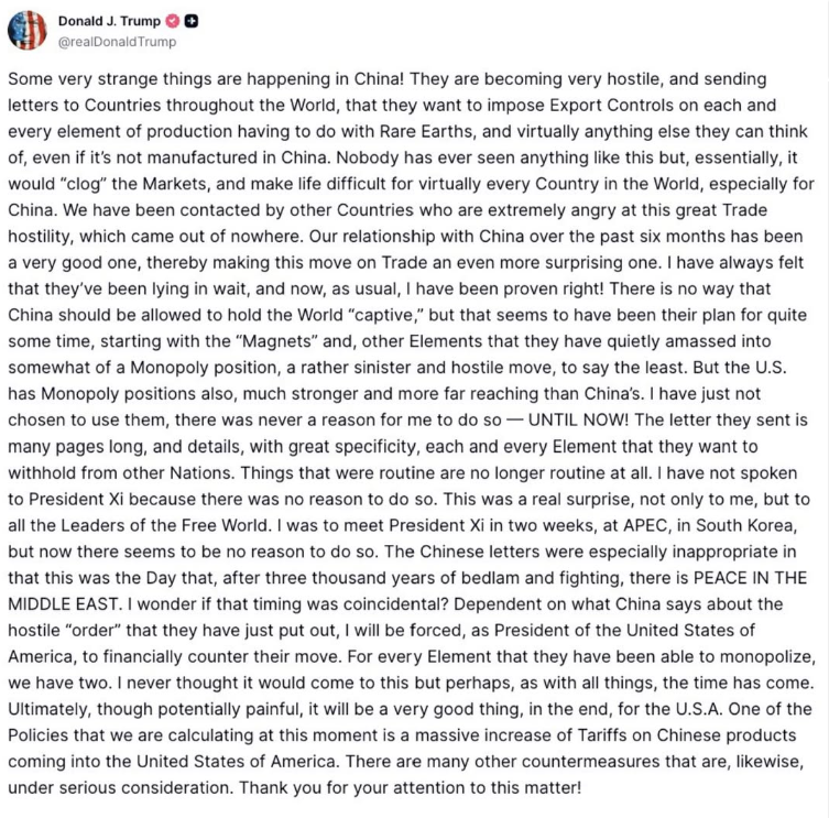 "Coisas muito estranhas estão acontecendo na China! Eles estão ficando muito hostis e enviando cartas a países de todo o mundo dizendo que querem impor controles de exportação sobre cada elemento da produção relacionado a terras raras e praticamente qualquer outra coisa que possam imaginar, mesmo que não seja fabricada na China.